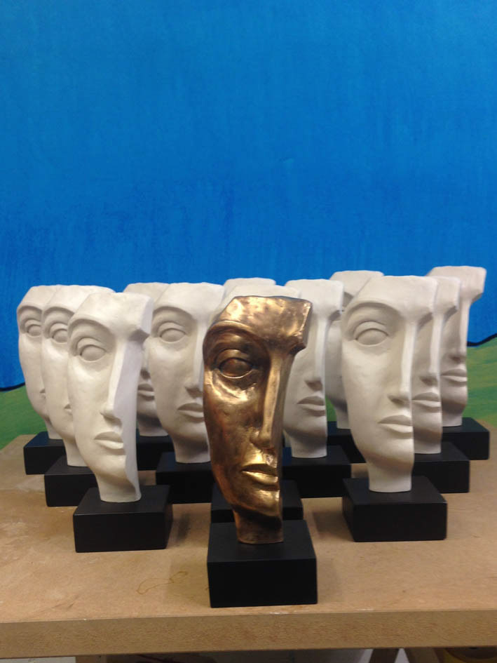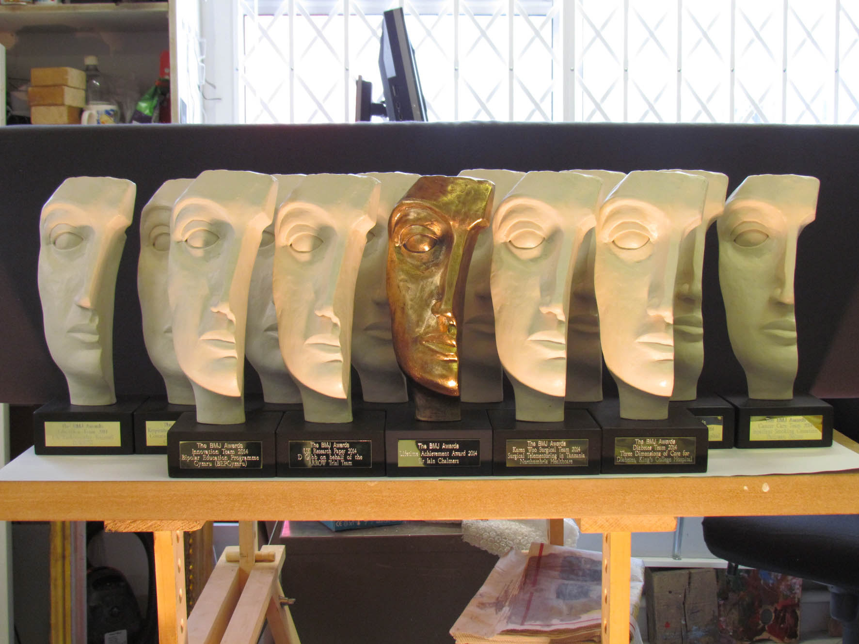 In 2014 British Medical Journal invited me to design an iconic sculpture to present to the winners at their annual award ceremony. Ideas for the award centred on Minerva, the name of a popular and regular columnist in the BMJ magazine, but also Roman goddess of wisdom and medicine, amongst others. I produced several maquettes. One maquette was then selected to be developed into the final design. This piece was inspired by the bust of Minerva found in Bath, England in 1727, a gilt bronze head, which is one of the best known objects from Roman Britain and a rare find. I wanted the face to be roughly life-size and as Minerva was often depicted with an owl - being a symbol of wisdom, I modelling its stylised form into the back of the head. Wanting the award to be truly three dimensional, it has surprising shapes from all views and bone/joint like qualities, especially when cast in white. The brief was to create one bronze award and twelve casts. These are in a material called Jesmonite which has strong stone like qualities.